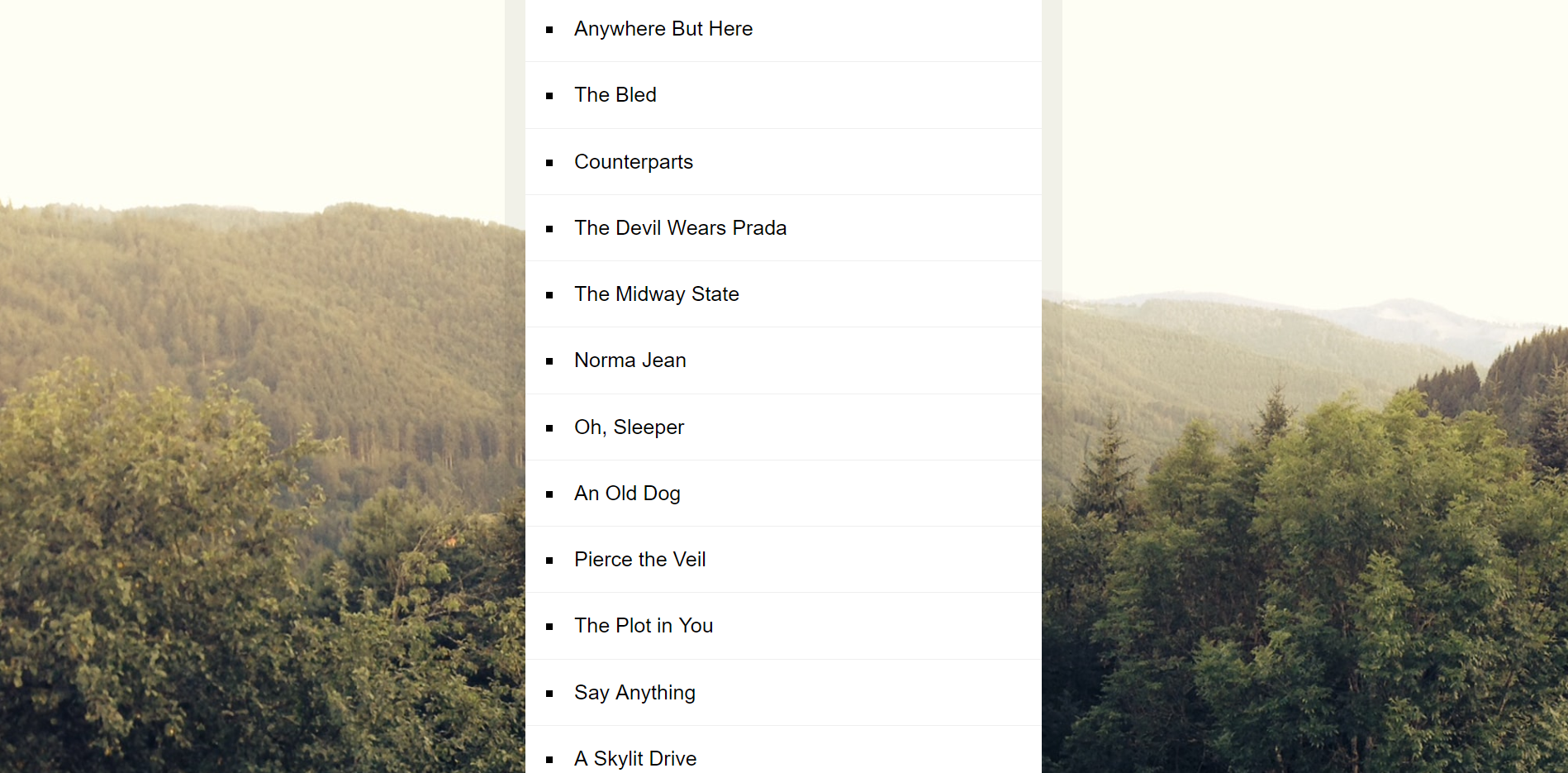 const bands = ['The Plot in You', 'The Devil Wears Prada', 'Pierce the Veil', 'Norma Jean', 'The Bled', 'Say Anything', 'The Midway State', 'We Came as Romans', 'Counterparts', 'Oh, Sleeper', 'A Skylit Drive', 'Anywhere But Here', 'An Old Dog'];