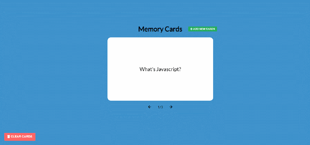 這是一個簡單的記憶卡程式,每一張卡片都會有一個問題&一個答案,點擊便可以翻轉卡片。卡片的資料我是存在localstorage內,所以即使離開頁面後再重返還是會看到你剛建立的卡片,若想要清除所有暫存的資料,請點擊左下的清理按鈕。