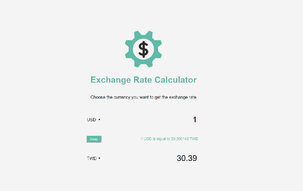 這是一個利用vanilla.js以及ExchaneRate API打造的匯率轉換器,基本原理非常的單純,也就只是利用fetch來的資料做動態DOM render。當你選定貨幣後便會有一行提示訊息告知你目前的比值,輸入數字後則會告訴你可以換到多少外幣~!